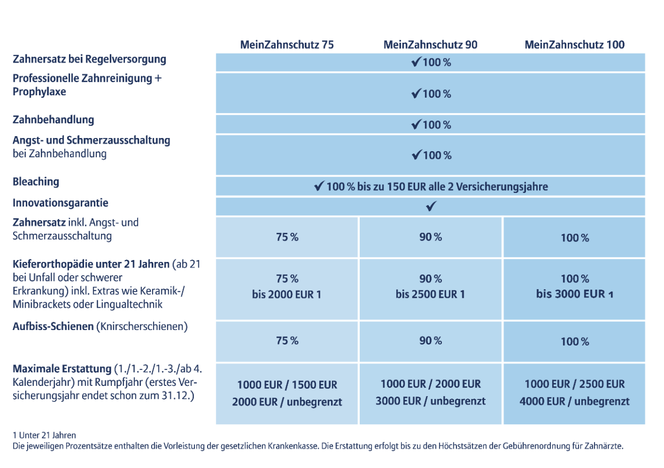 100 % Schutz für Zahnbehandlungen plus starker 75 % Schutz für Zahnersatz, Kieferorthopädie und Aufbiss-Schienen.